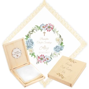 Personalizowane szatka i grawerowane pudełko z imieniem - piękna pamiątka i idealny prezent dla chrześniaka.