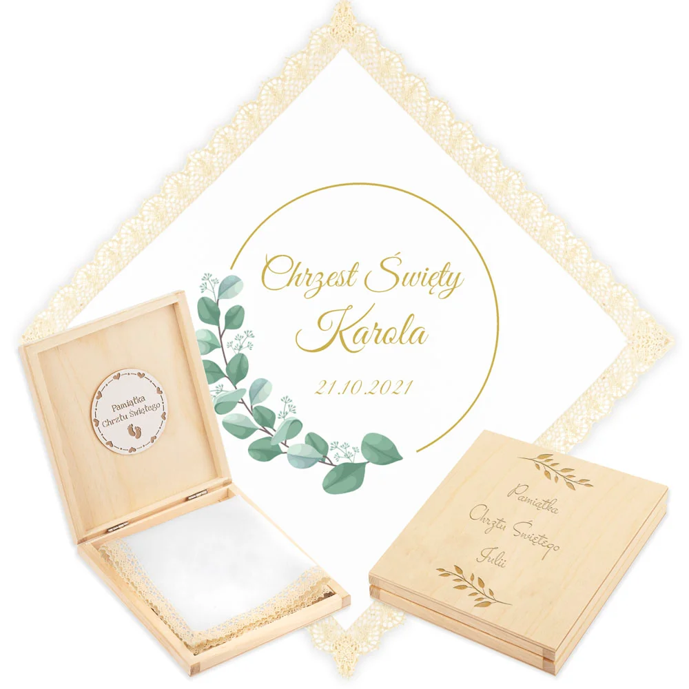 Personalizowane szatka i grawerowane pudełko z imieniem - piękna pamiątka i idealny prezent dla chrześniaka.