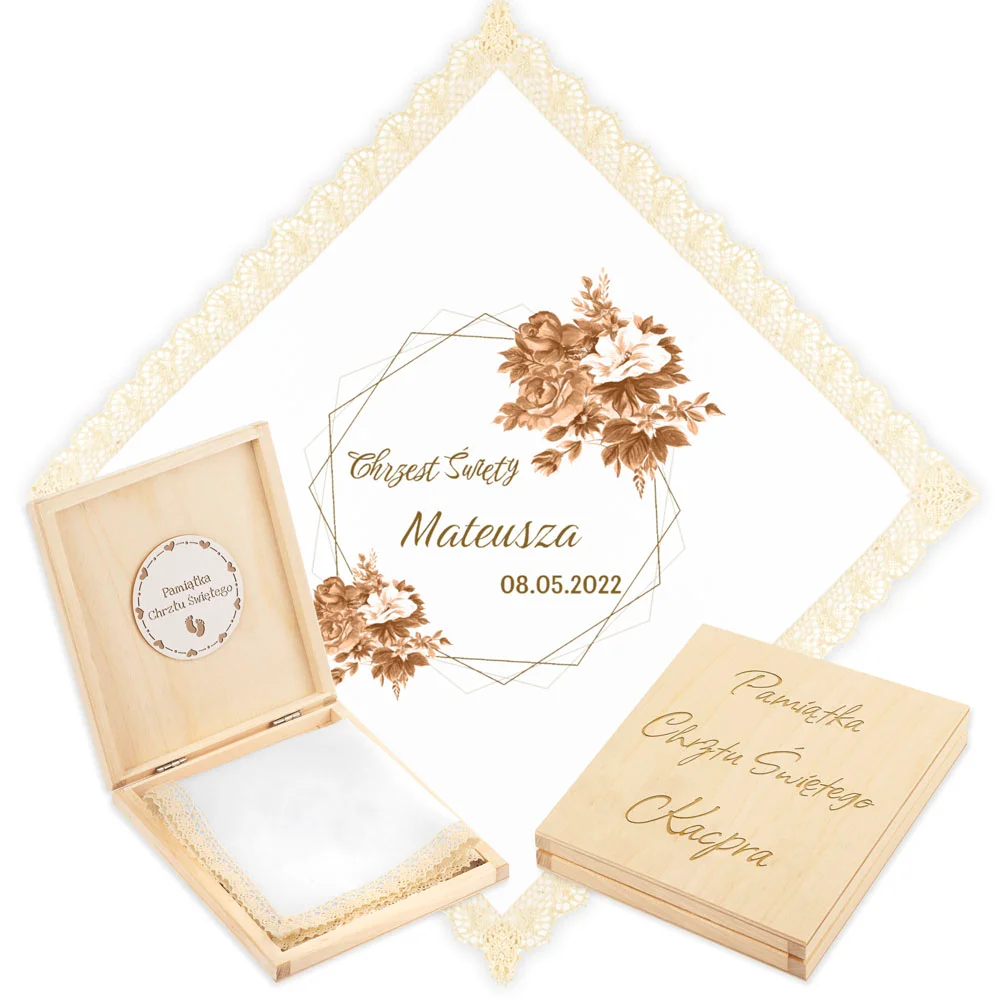 Personalizowane szatka i grawerowane pudełko z imieniem - piękna pamiątka i idealny prezent dla chrześniaka.