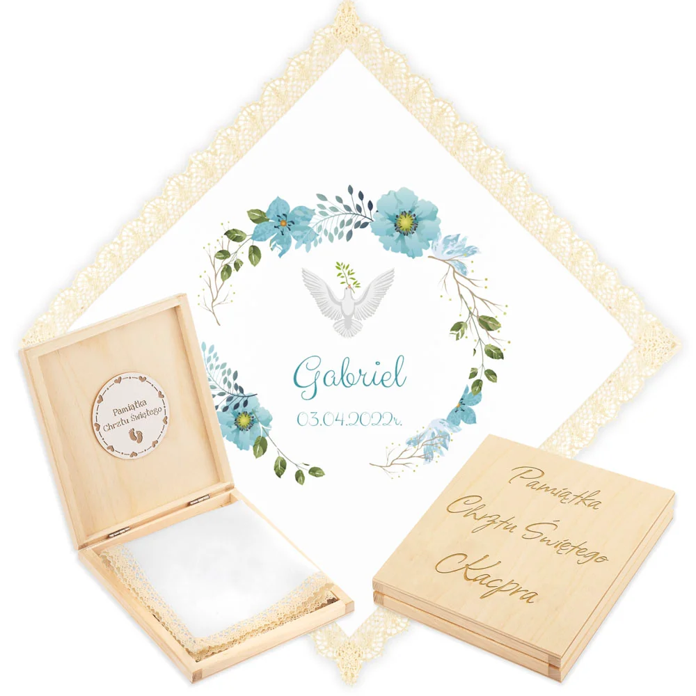 Personalizowane szatka i grawerowane pudełko z imieniem - piękna pamiątka i idealny prezent dla chrześniaka.