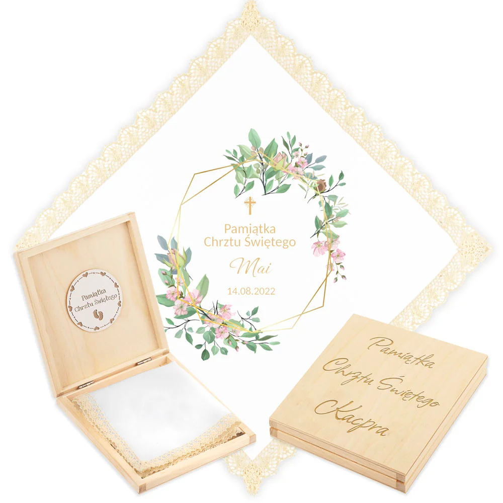 Personalizowane szatka i grawerowane pudełko z imieniem - piękna pamiątka i idealny prezent dla chrześniaka.