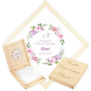 Personalizowane szatka i grawerowane pudełko z imieniem - piękna pamiątka i idealny prezent dla chrześniaka.