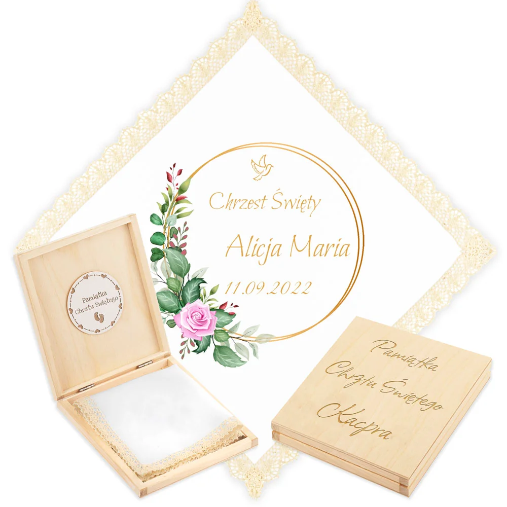 Personalizowane szatka i grawerowane pudełko z imieniem - piękna pamiątka i idealny prezent dla chrześniaka.