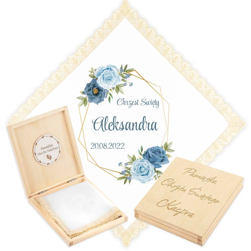Personalizowane szatka i grawerowane pudełko z imieniem - piękna pamiątka i idealny prezent dla chrześniaka.