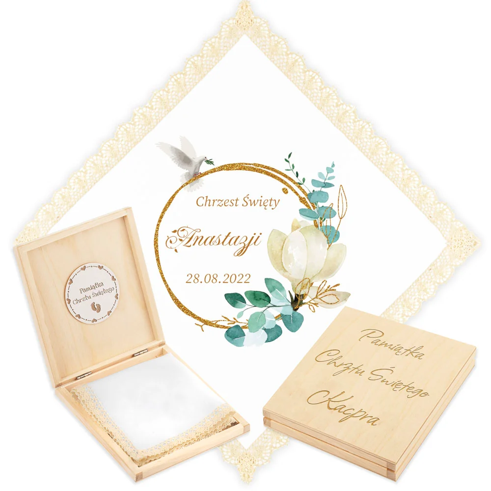 Personalizowane szatka i grawerowane pudełko z imieniem - piękna pamiątka i idealny prezent dla chrześniaka.