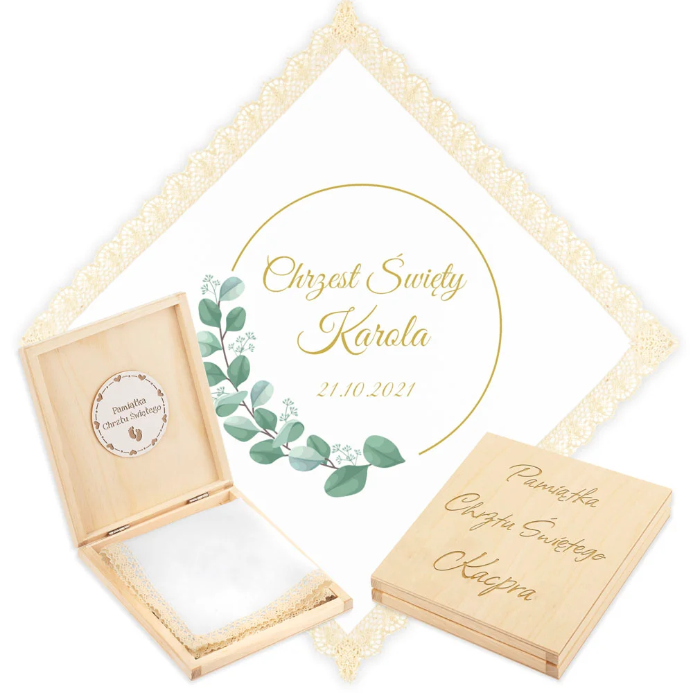 Personalizowane szatka i grawerowane pudełko z imieniem - piękna pamiątka i idealny prezent dla chrześniaka.