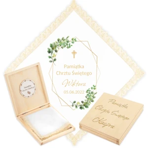 Personalizowane szatka i grawerowane pudełko z imieniem - piękna pamiątka i idealny prezent dla chrześniaka.