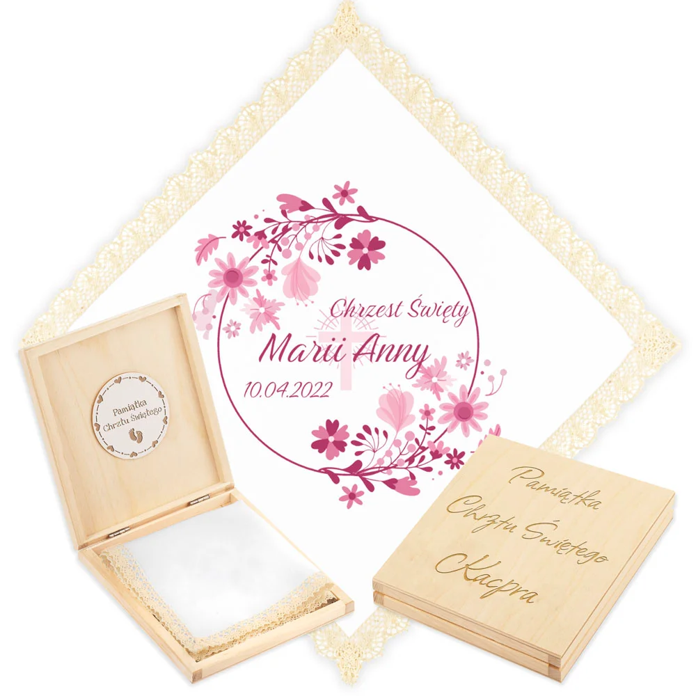 Personalizowane szatka i grawerowane pudełko z imieniem - piękna pamiątka i idealny prezent dla chrześniaka.