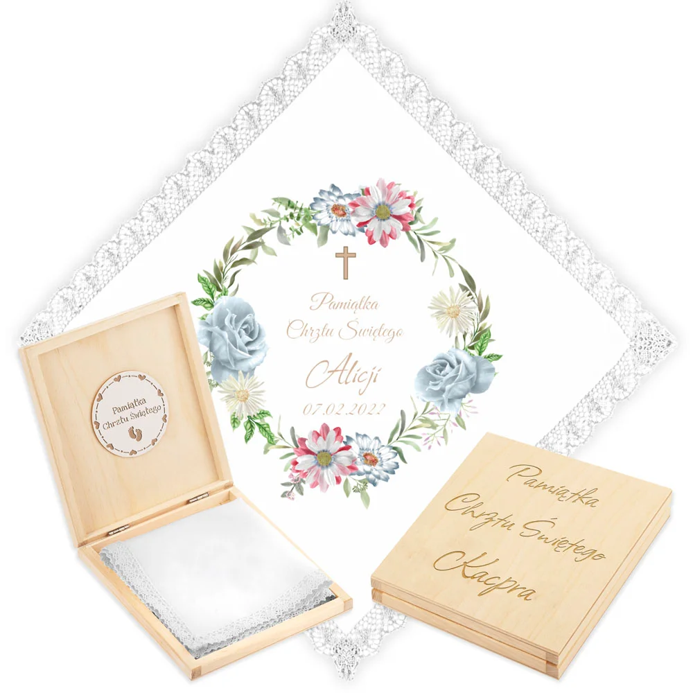 Personalizowane szatka i grawerowane pudełko z imieniem - piękna pamiątka i idealny prezent dla chrześniaka.