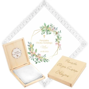 Personalizowane szatka i grawerowane pudełko z imieniem - piękna pamiątka i idealny prezent dla chrześniaka.