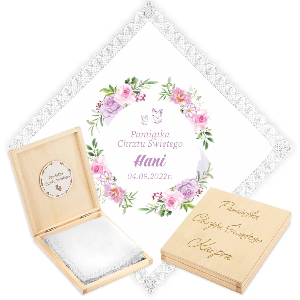 Personalizowane szatka i grawerowane pudełko z imieniem - piękna pamiątka i idealny prezent dla chrześniaka.