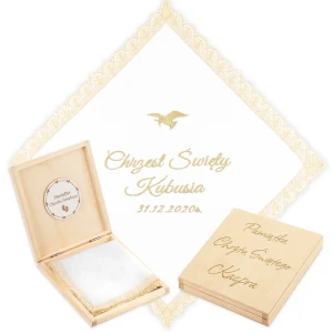 Personalizowane szatka i grawerowane pudełko z imieniem - piękna pamiątka i idealny prezent dla chrześniaka.