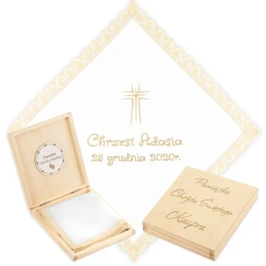 Personalizowane szatka i grawerowane pudełko z imieniem - piękna pamiątka i idealny prezent dla chrześniaka.