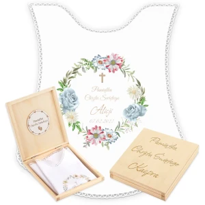 Personalizowane szatka i grawerowane pudełko z imieniem - piękna pamiątka i idealny prezent dla chrześniaka.