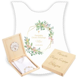Personalizowane szatka i grawerowane pudełko z imieniem - piękna pamiątka i idealny prezent dla chrześniaka.