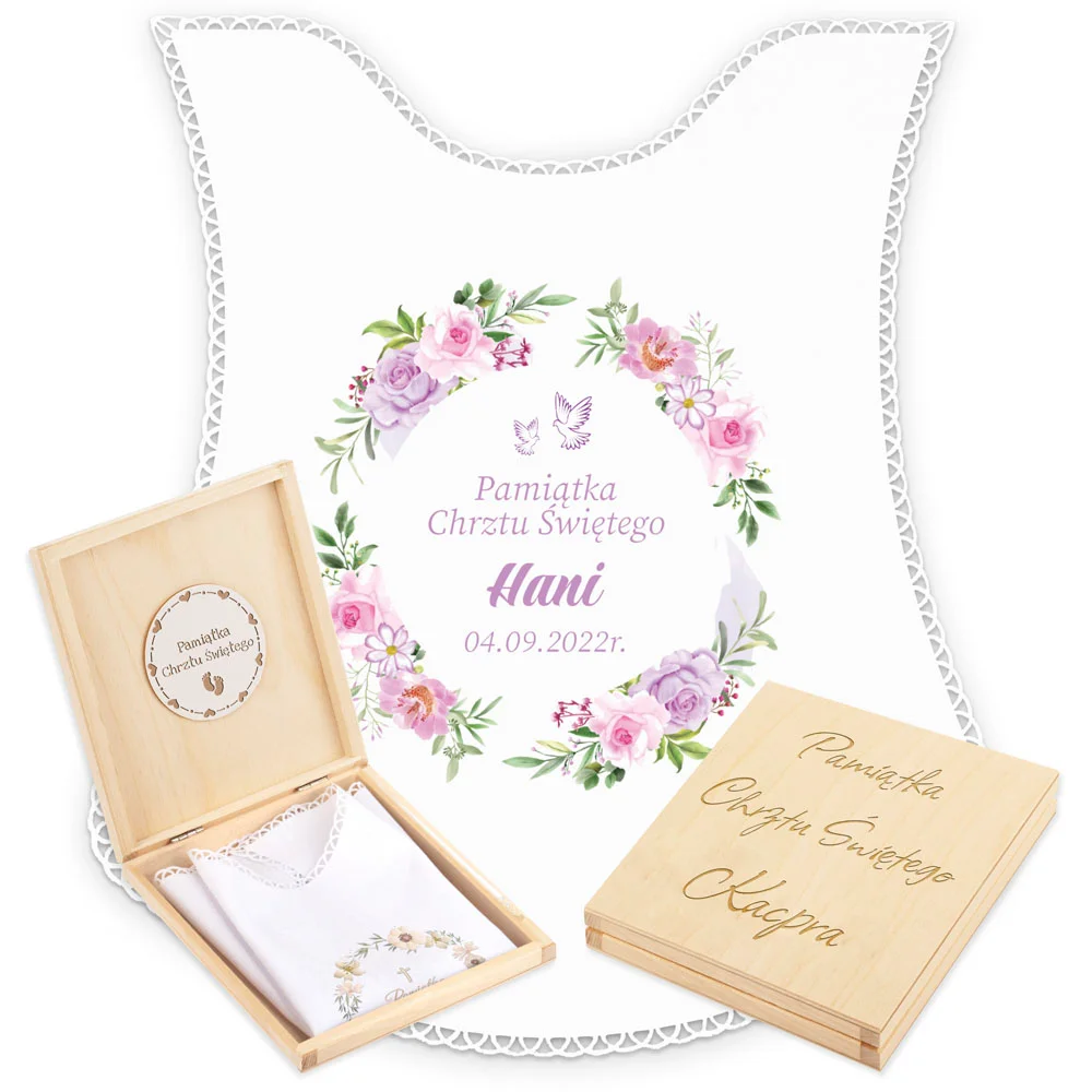 Personalizowane szatka i grawerowane pudełko z imieniem - piękna pamiątka i idealny prezent dla chrześniaka.
