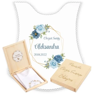 Personalizowane szatka i grawerowane pudełko z imieniem - piękna pamiątka i idealny prezent dla chrześniaka.
