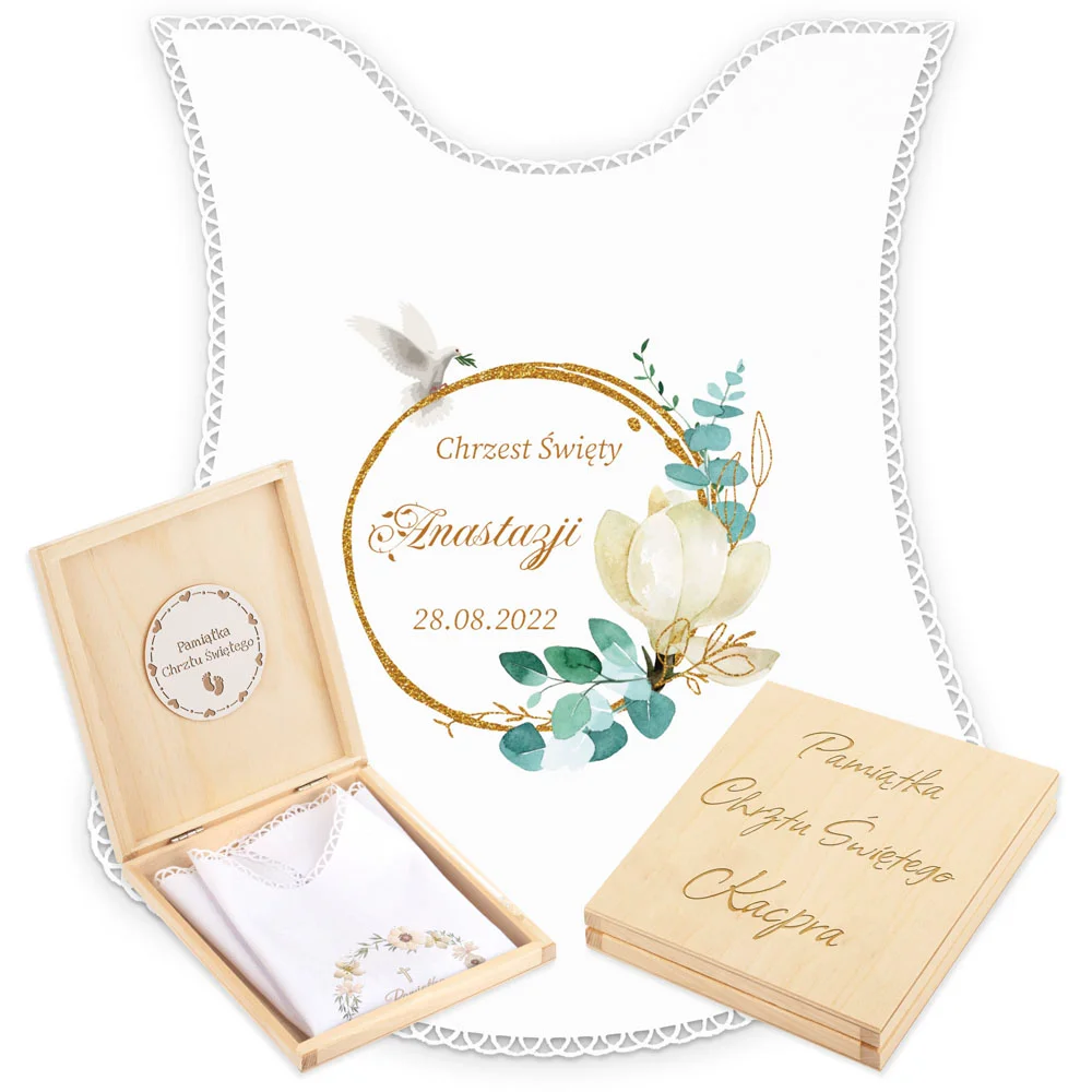 Personalizowane szatka i grawerowane pudełko z imieniem - piękna pamiątka i idealny prezent dla chrześniaka.