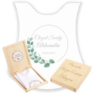 Personalizowane szatka i grawerowane pudełko z imieniem - piękna pamiątka i idealny prezent dla chrześniaka.