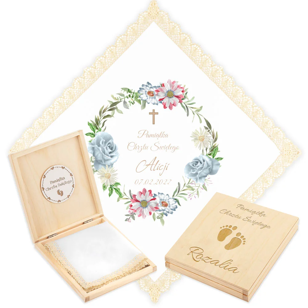 Personalizowane szatka i grawerowane pudełko z imieniem - piękna pamiątka i idealny prezent dla chrześniaka.