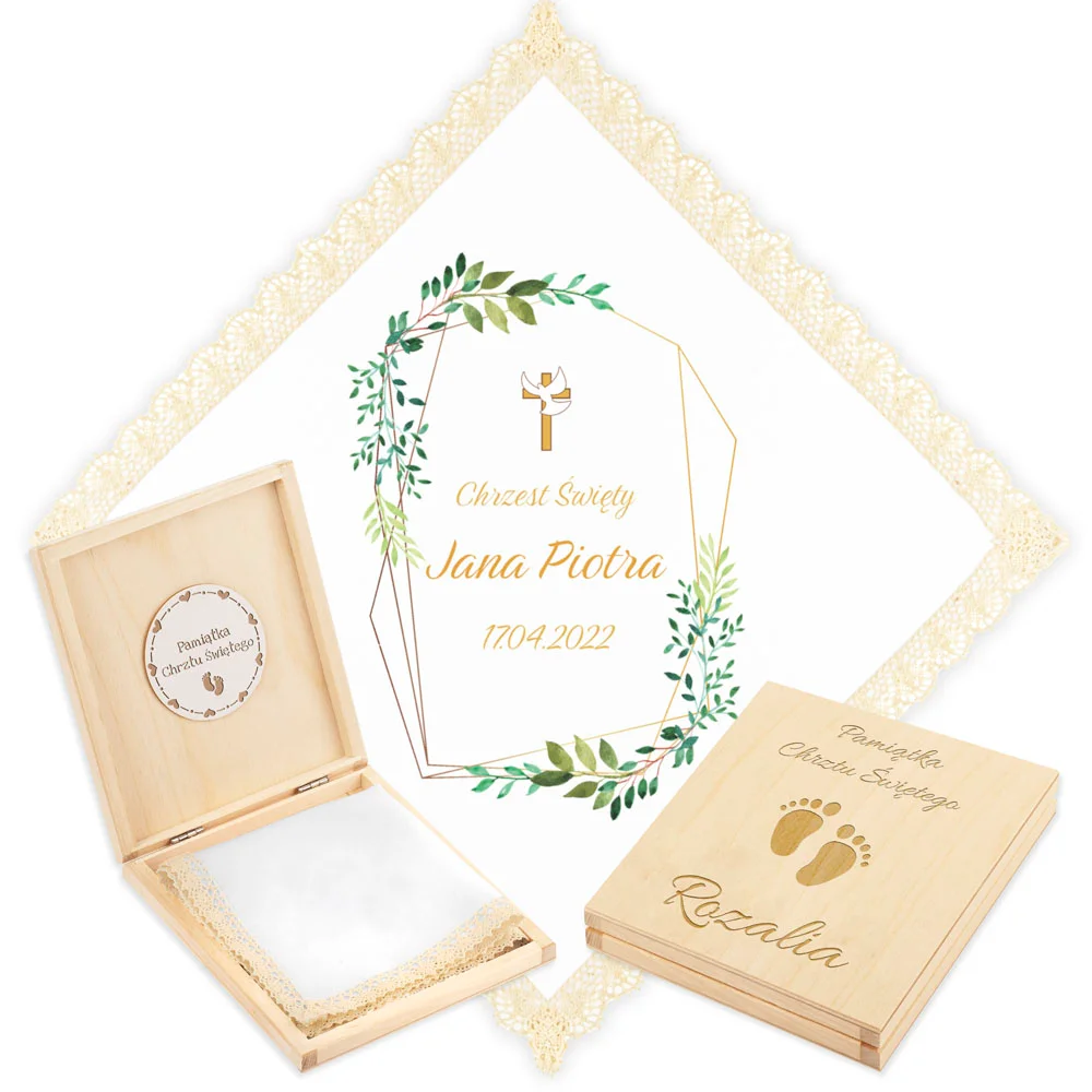 Personalizowane szatka i grawerowane pudełko z imieniem - piękna pamiątka i idealny prezent dla chrześniaka.