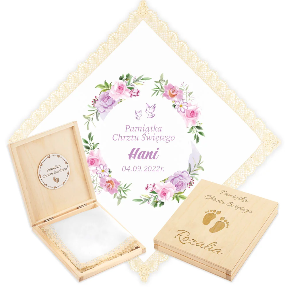 Personalizowane szatka i grawerowane pudełko z imieniem - piękna pamiątka i idealny prezent dla chrześniaka.