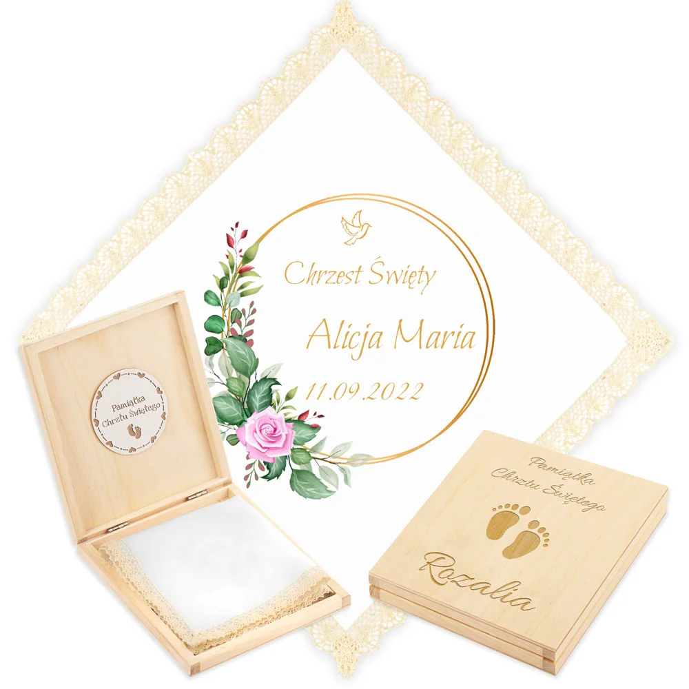 Personalizowane szatka i grawerowane pudełko z imieniem - piękna pamiątka i idealny prezent dla chrześniaka.