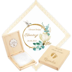 Personalizowane szatka i grawerowane pudełko z imieniem - piękna pamiątka i idealny prezent dla chrześniaka.