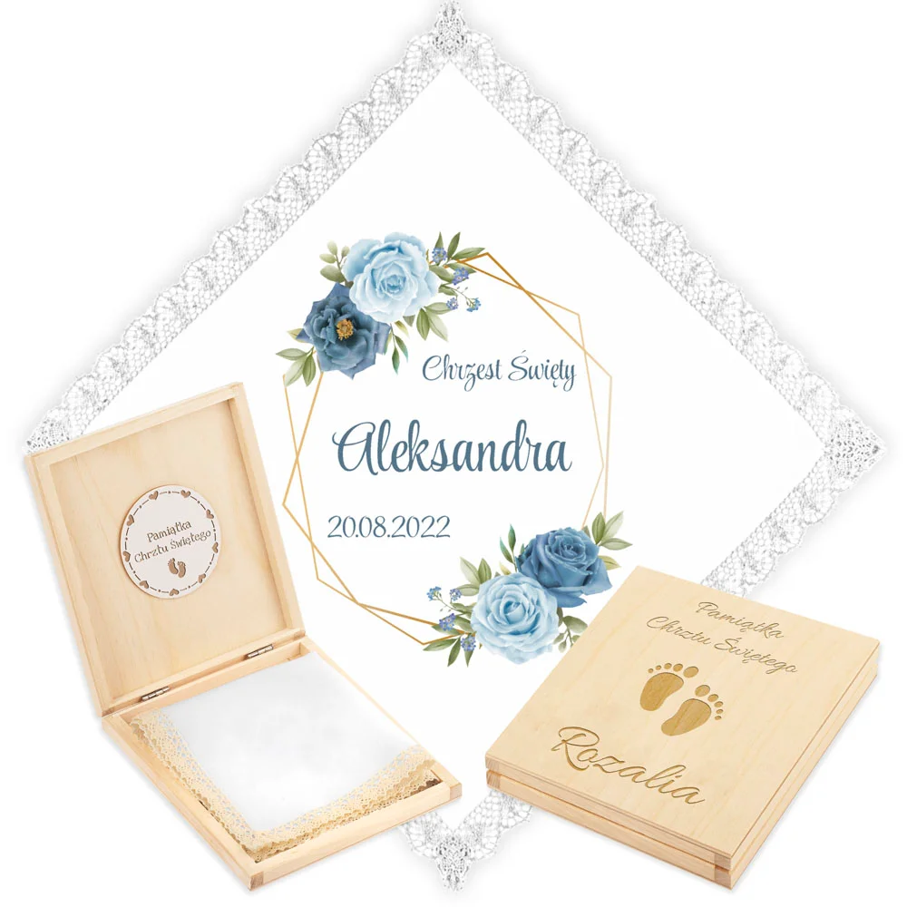Personalizowane szatka i grawerowane pudełko z imieniem - piękna pamiątka i idealny prezent dla chrześniaka.