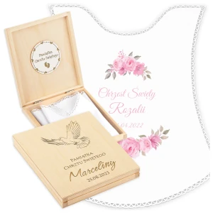 Personalizowane szatka i grawerowane pudełko z imieniem - piękna pamiątka i idealny prezent dla chrześniaka.