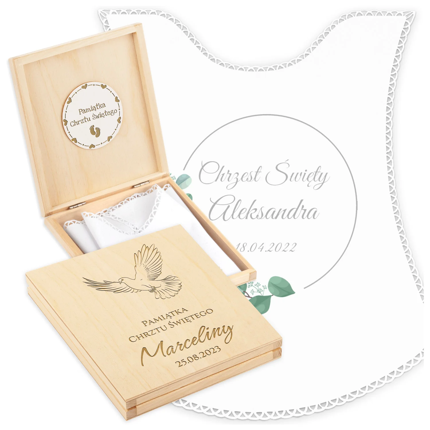Personalizowane szatka i grawerowane pudełko z imieniem - piękna pamiątka i idealny prezent dla chrześniaka.