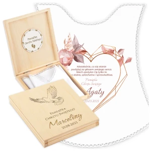 Personalizowane szatka i grawerowane pudełko z imieniem - piękna pamiątka i idealny prezent dla chrześniaka.