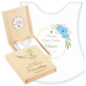 Personalizowane szatka i grawerowane pudełko z imieniem - piękna pamiątka i idealny prezent dla chrześniaka.
