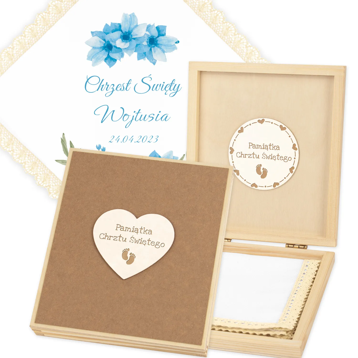 Personalizowane szatka i grawerowane pudełko z imieniem - piękna pamiątka i idealny prezent dla chrześniaka.