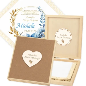 Personalizowane szatka i grawerowane pudełko z imieniem - piękna pamiątka i idealny prezent dla chrześniaka.