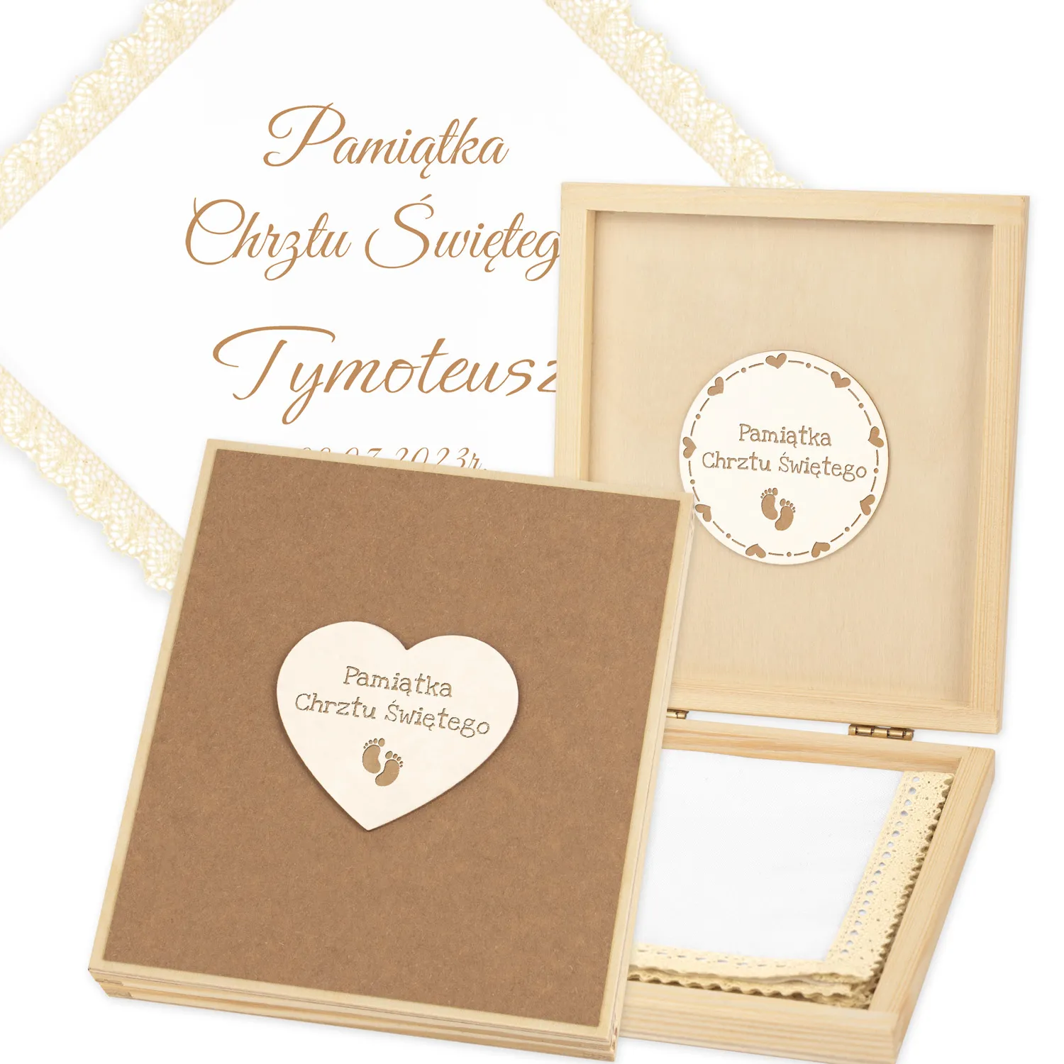 Personalizowane szatka i grawerowane pudełko z imieniem - piękna pamiątka i idealny prezent dla chrześniaka.